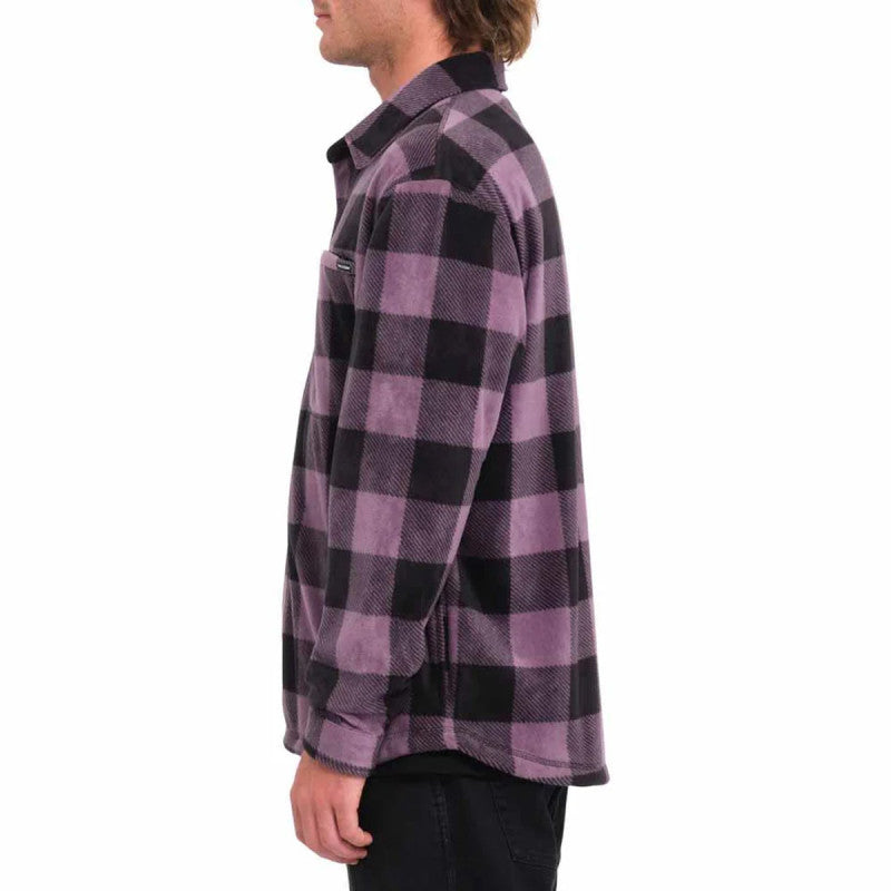 The BOWERED LIGHT LS features a men's polar fleece over-shirt with a classic fit. It includes a chest zip pocket and sideseam hand pockets, as well as Volcom Stone left sleeve embroidery and a sew-down woven label on the chest pocket. The snap front closure and Volcom branded metal trims add to its weight of 230g.