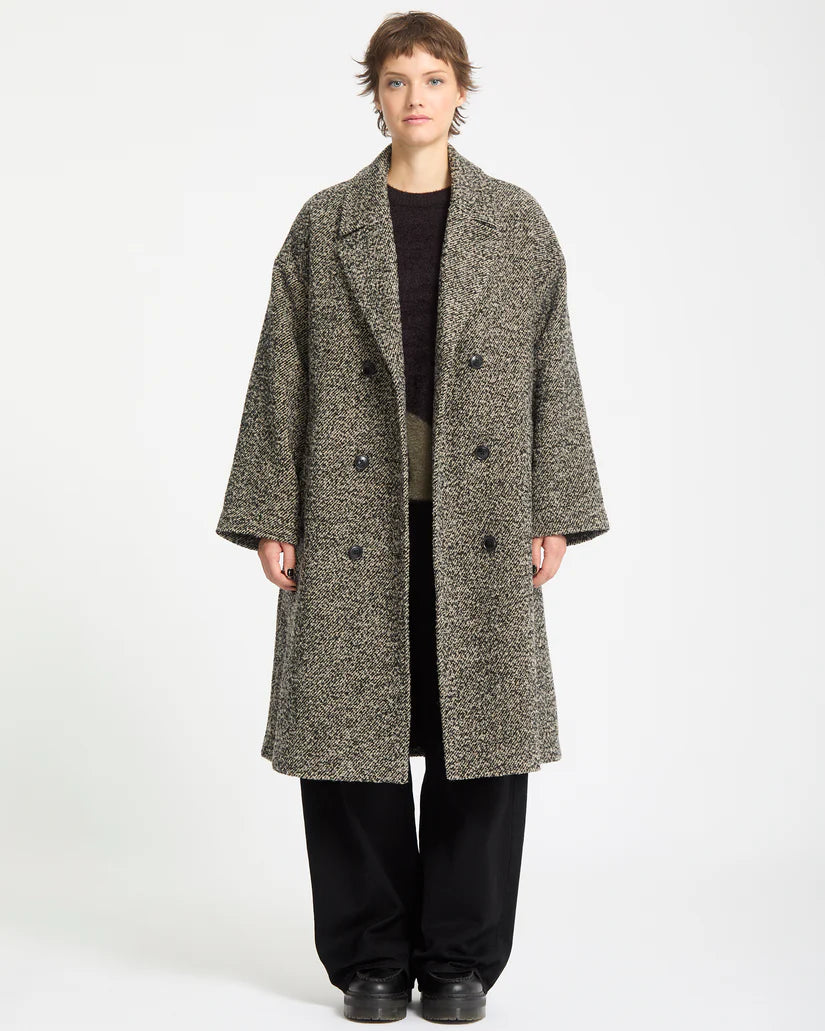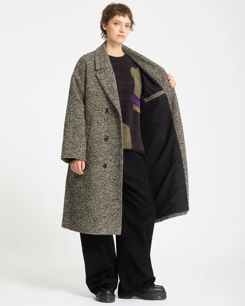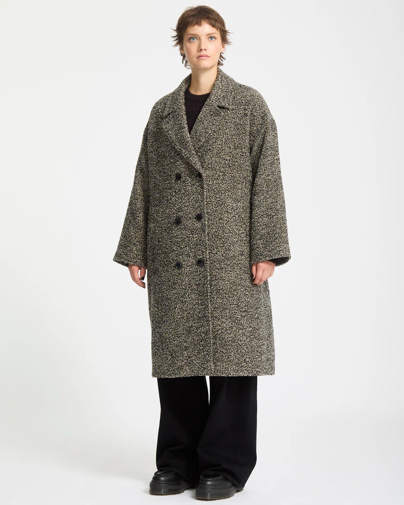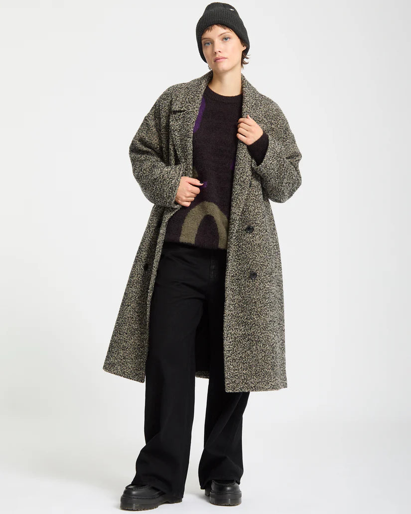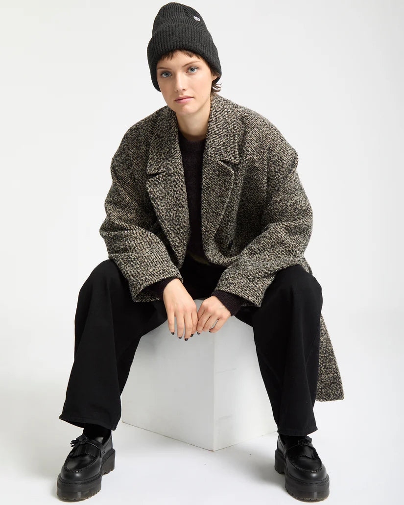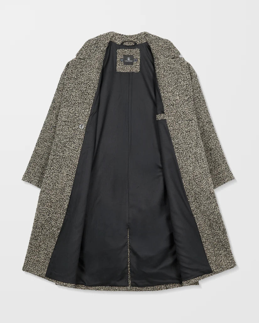 This women’s long-length coat features an oversized silhouette crafted from black and white textured twill. It closes with six front buttons and includes lower welt pockets for convenience. A removable self-fabric belt defines the waist, while a Volcom metal plate adorns the center back. Made with a minimum of 30% recycled polyester, the coat weighs 530 g and measures 43" (109 cm) in length for size Small.