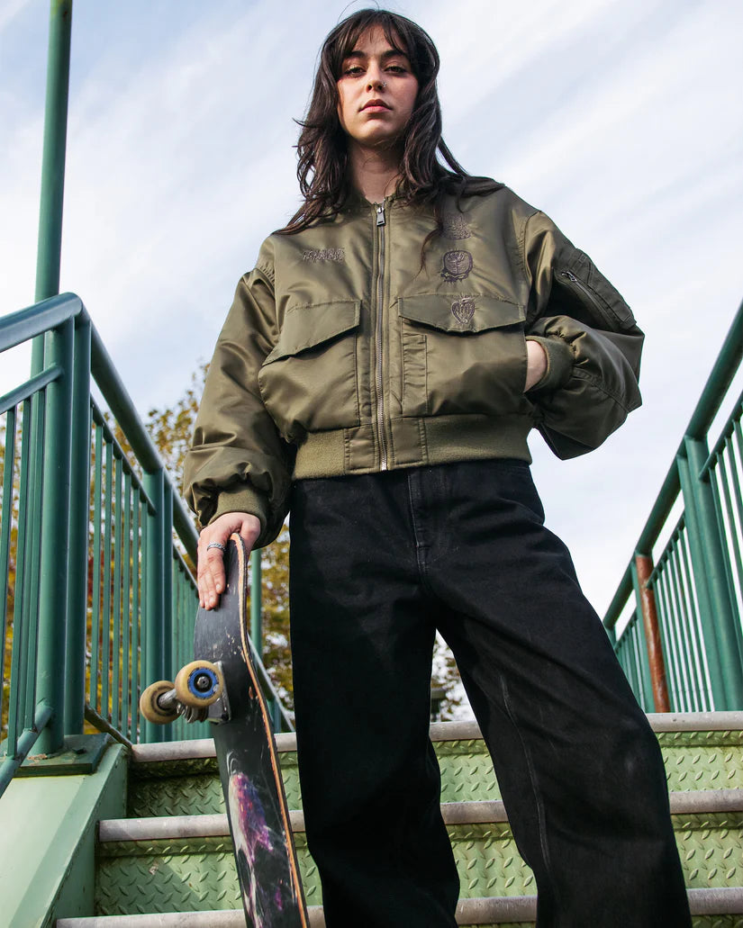 This women’s bomber jacket features a relaxed, loose fit with a cropped, waist-length design. It includes a metallic zip closure at the front center and ribbed trim on the collar, cuffs, and hem. Practical details include lower patch pockets and a zippered pocket on the sleeve. The jacket is embellished with embroidered artwork on both the front and back, created by the featured artist Vaderetro, and is branded with an artist label on the right patch pocket. It is fully lined with 100% polyester and measures 23.5" (60 cm) in length for size Small.