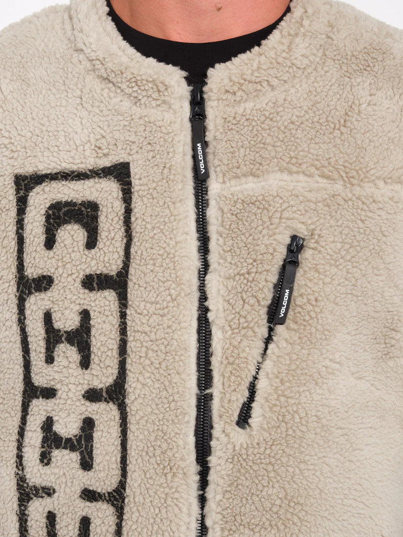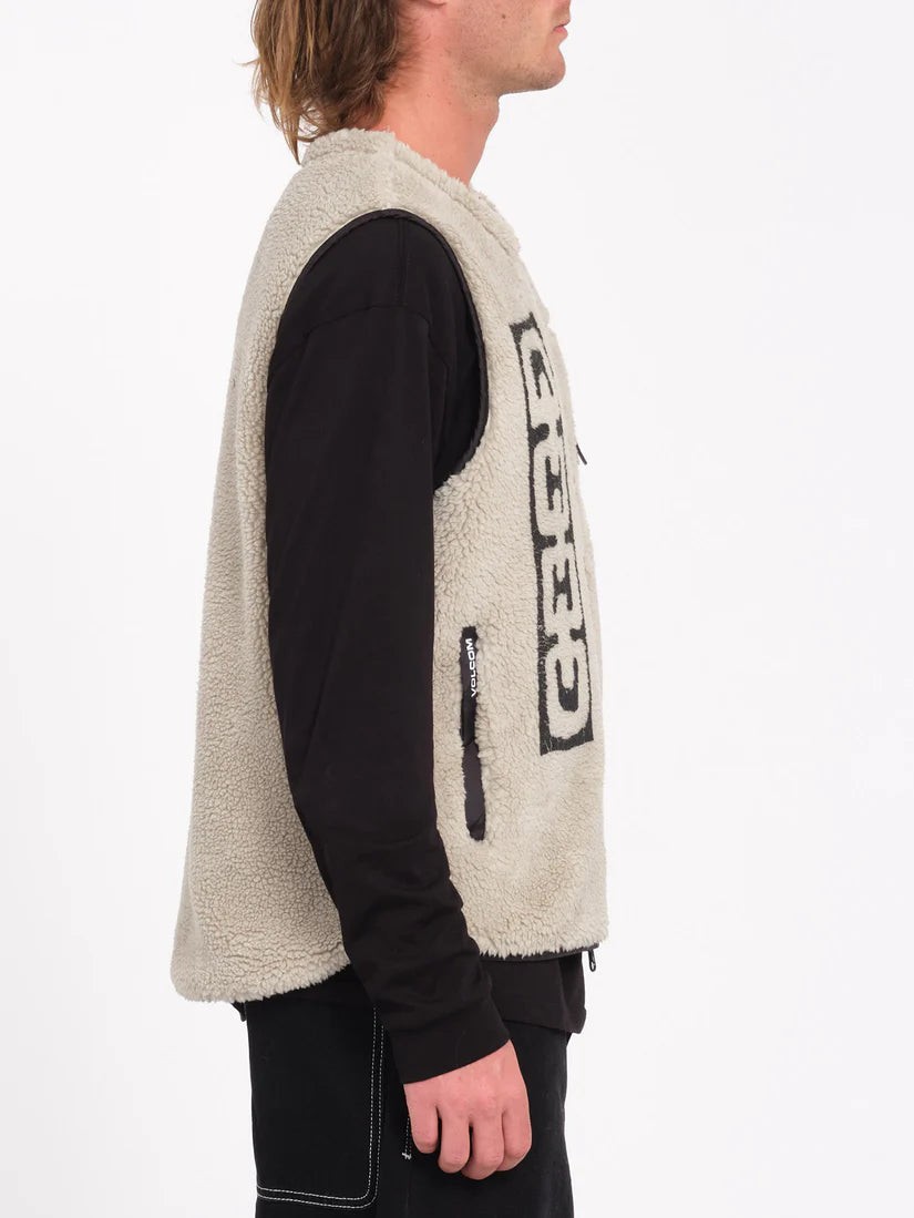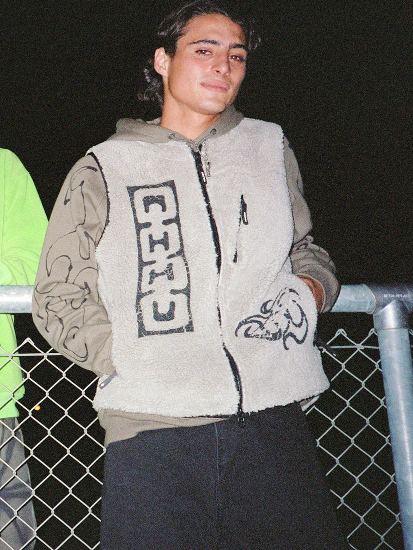 This custom men's vest features a sherpa lining, convenient zip pockets, and a mesh lining for breathability. Made with at least 30% recycled polyester, this vest is environmentally friendly. The length for a size Medium is 26.5" (67 cm) from shoulder to bottom, and it weighs 390g. With a double-way center zip and Volcom Outdoor trims, this vest is a versatile and functional choice for any outdoor enthusiast. Showcasing prints by Featured Artist Zephyr, this vest combines style and sustainability.