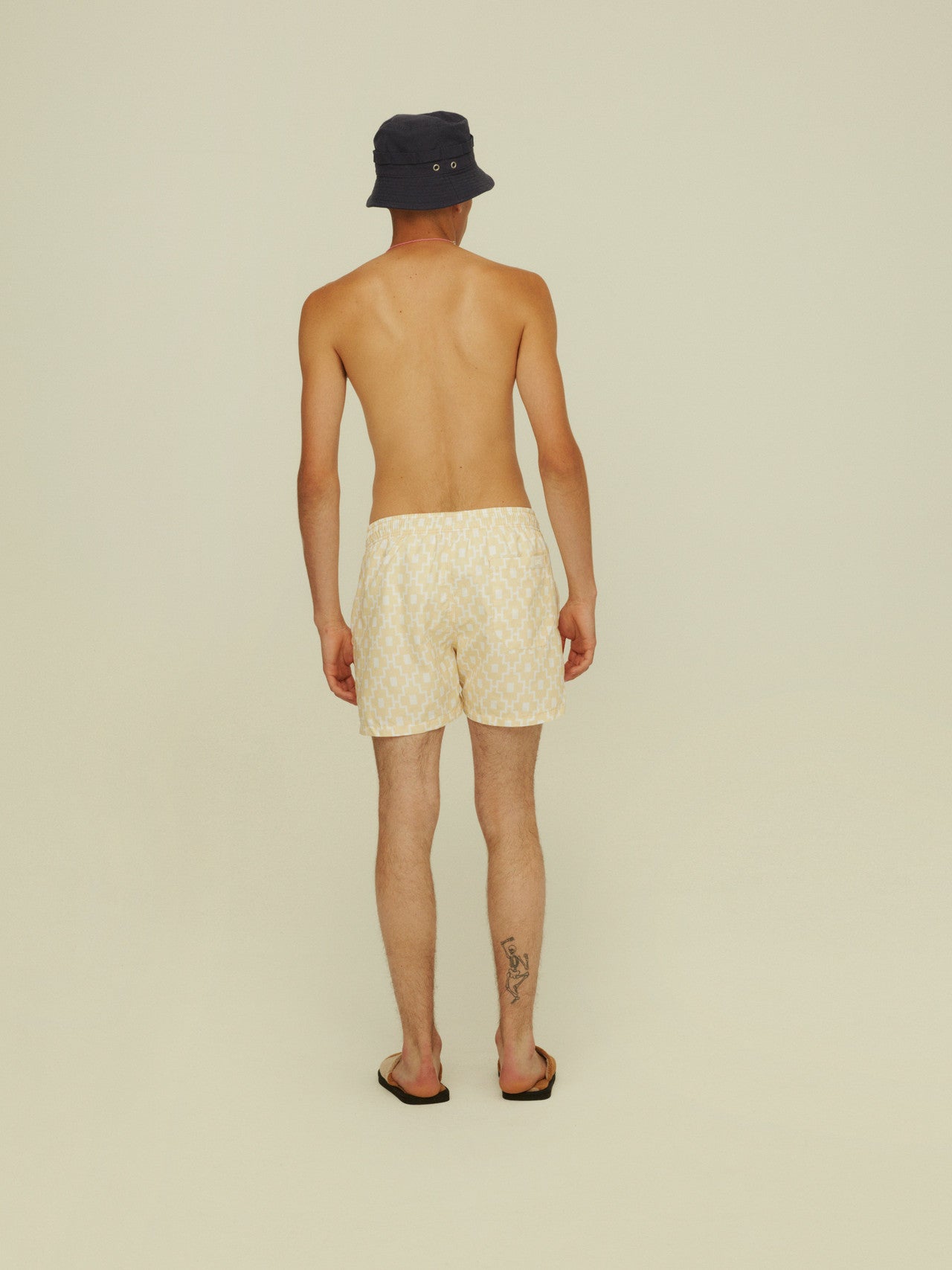 Inspired by ancient motifs the Machu pattern is designed with a combination of soft yellow and cream. The quick-drying pair of swim shorts are designed with four pockets including a hidden zip pocket on the side and a mesh lining. Created for comfort and style, the swim shorts are lightweight, true in size, and have a peach finish.