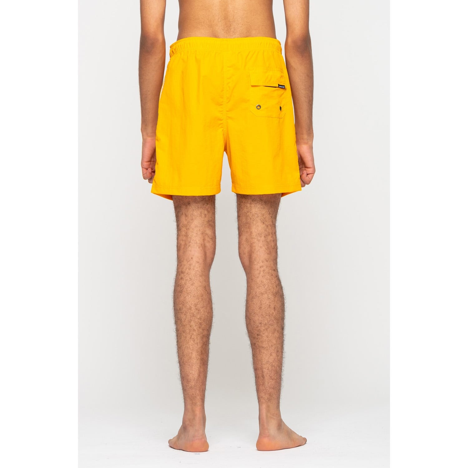 100% nylon, elasticated waist swimshort with 17" outseam, side pockets and back pocket, all over Aqua React print that's visible when wet and small hem embroidery.