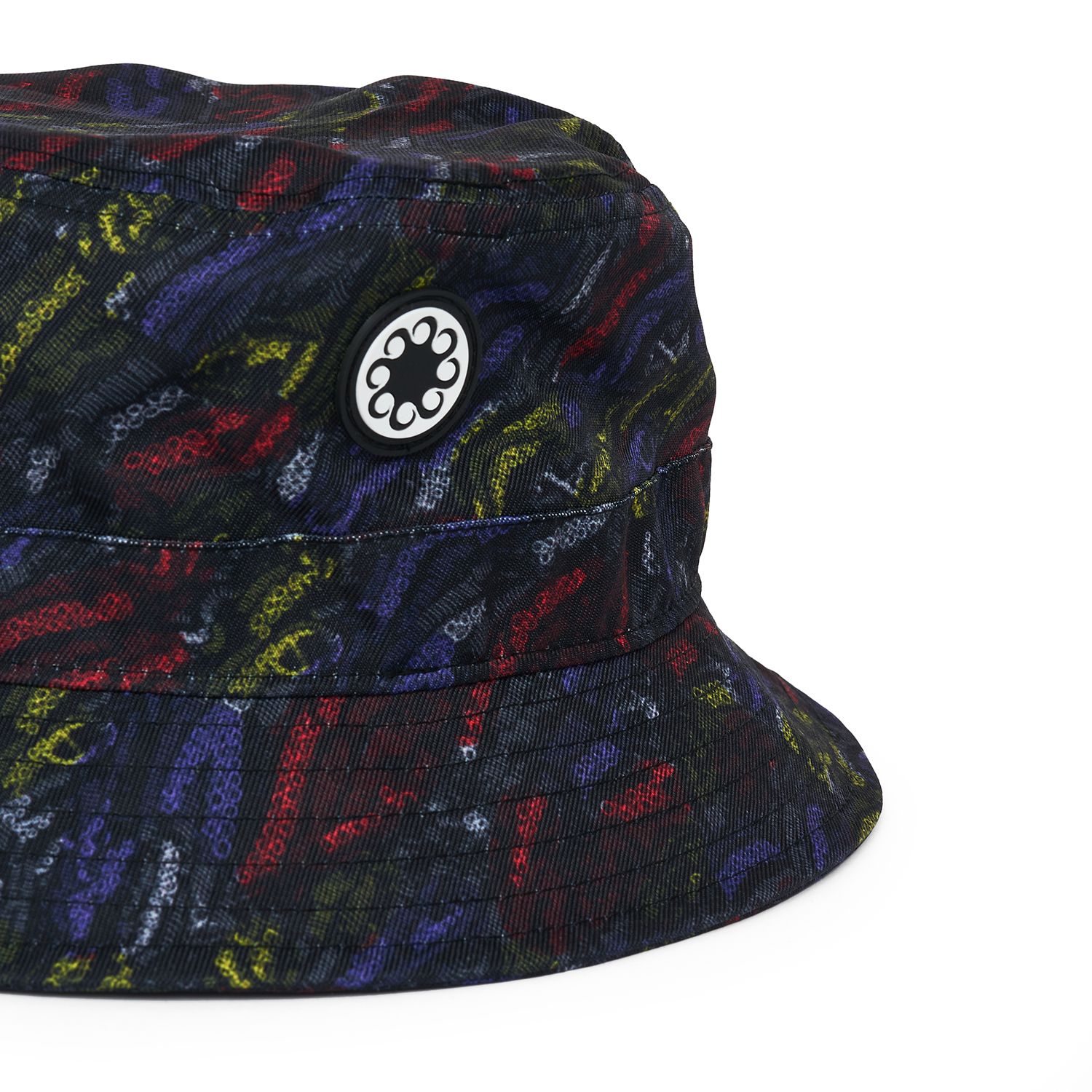 Allover printed bucket hat with embroideries and PVC patches.