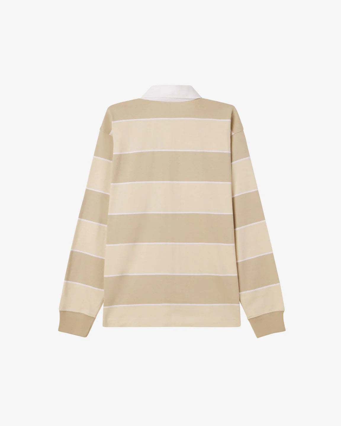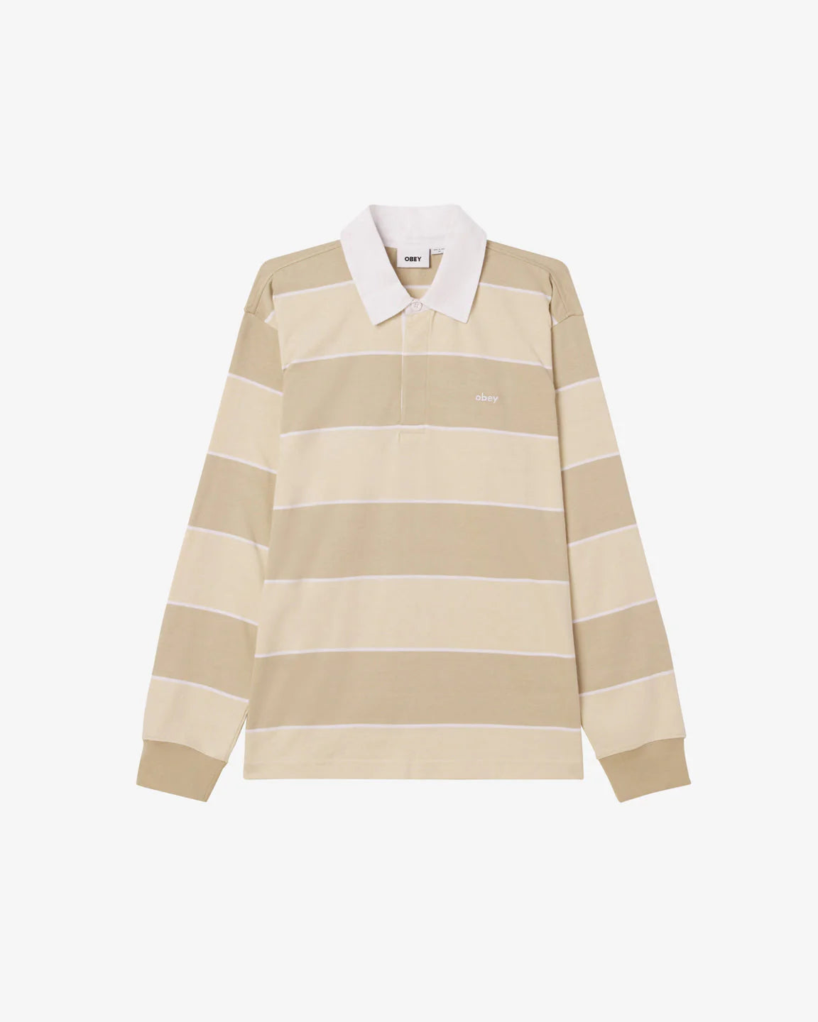 This ORIGIN RUGBY LS POLO features a stripe jersey, constrast twill collar, hidden button placket, rib cuff, and fair trade 100% cotton construction for a relaxed fit. Expertly embroidered with the Obey logo on the chest.