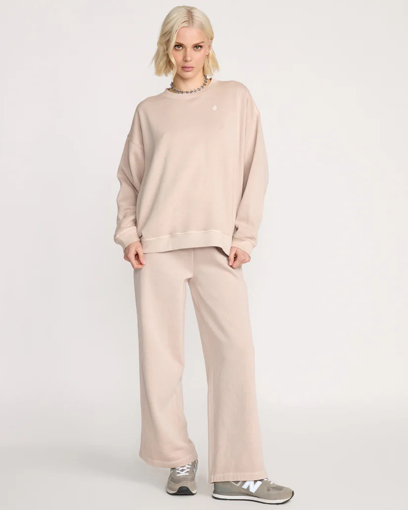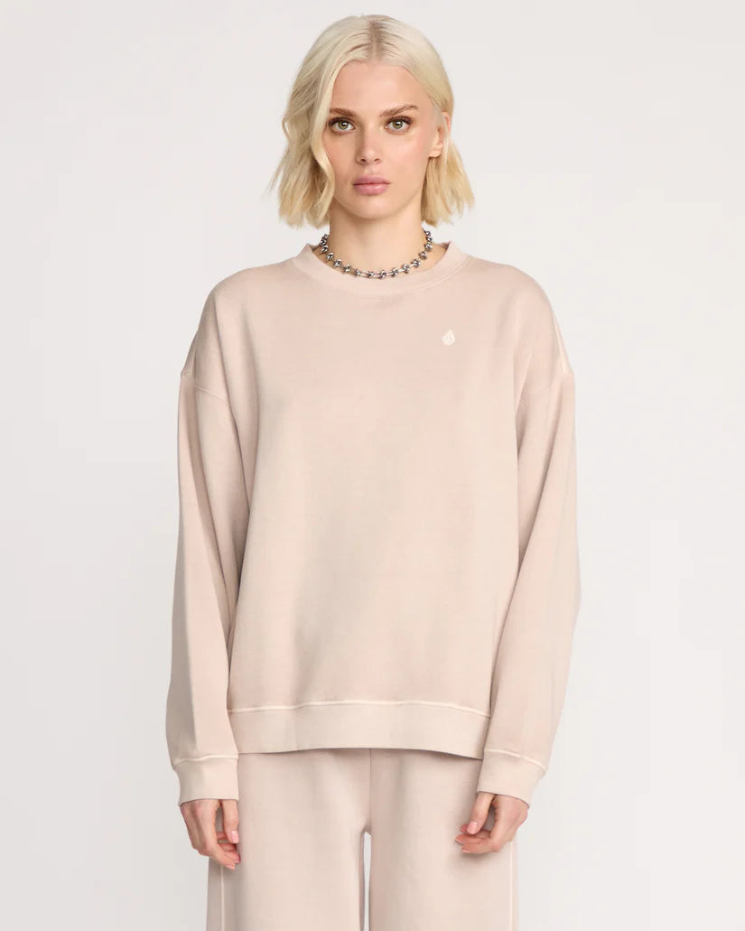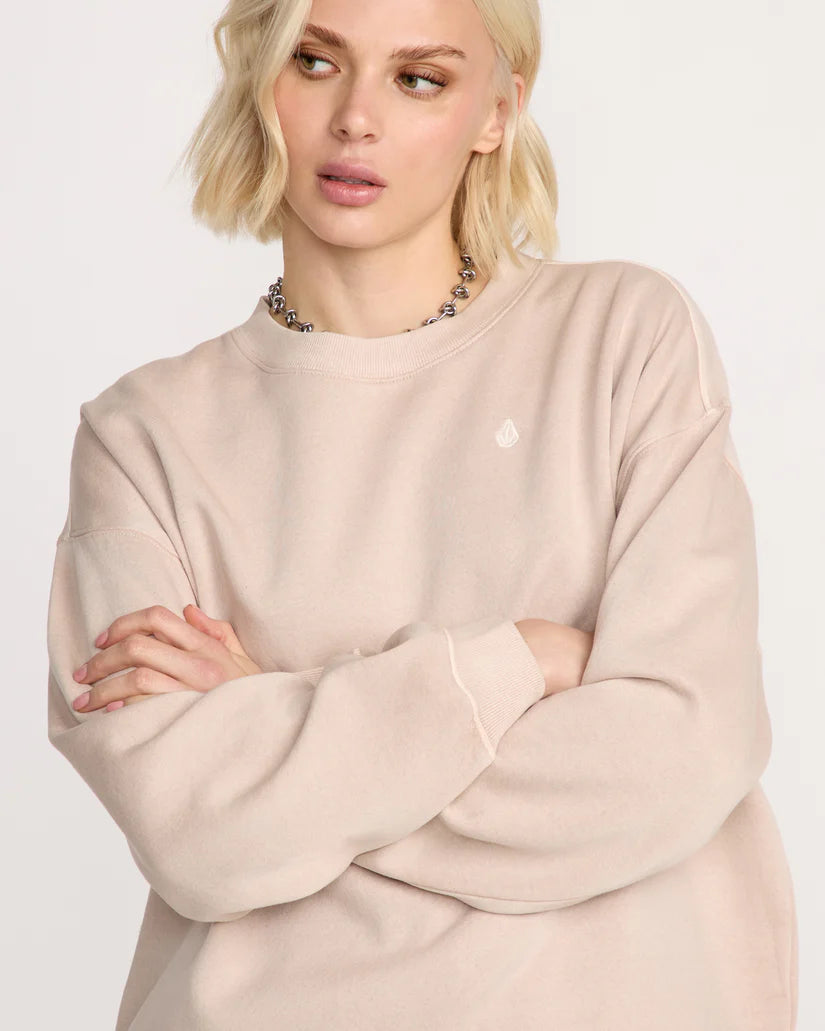 This women's sweatshirt features a relaxed fit with a classic round neckline and stone wash finish. It is detailed with ribbed cuffs, waistband, and neckband, complemented by a black and white split interior neck tape. Embroidered stone accents appear on the chest, with Volcom branding on the back. The size S measures 24" (61 cm) in length from shoulder to hem and weighs 325 g.