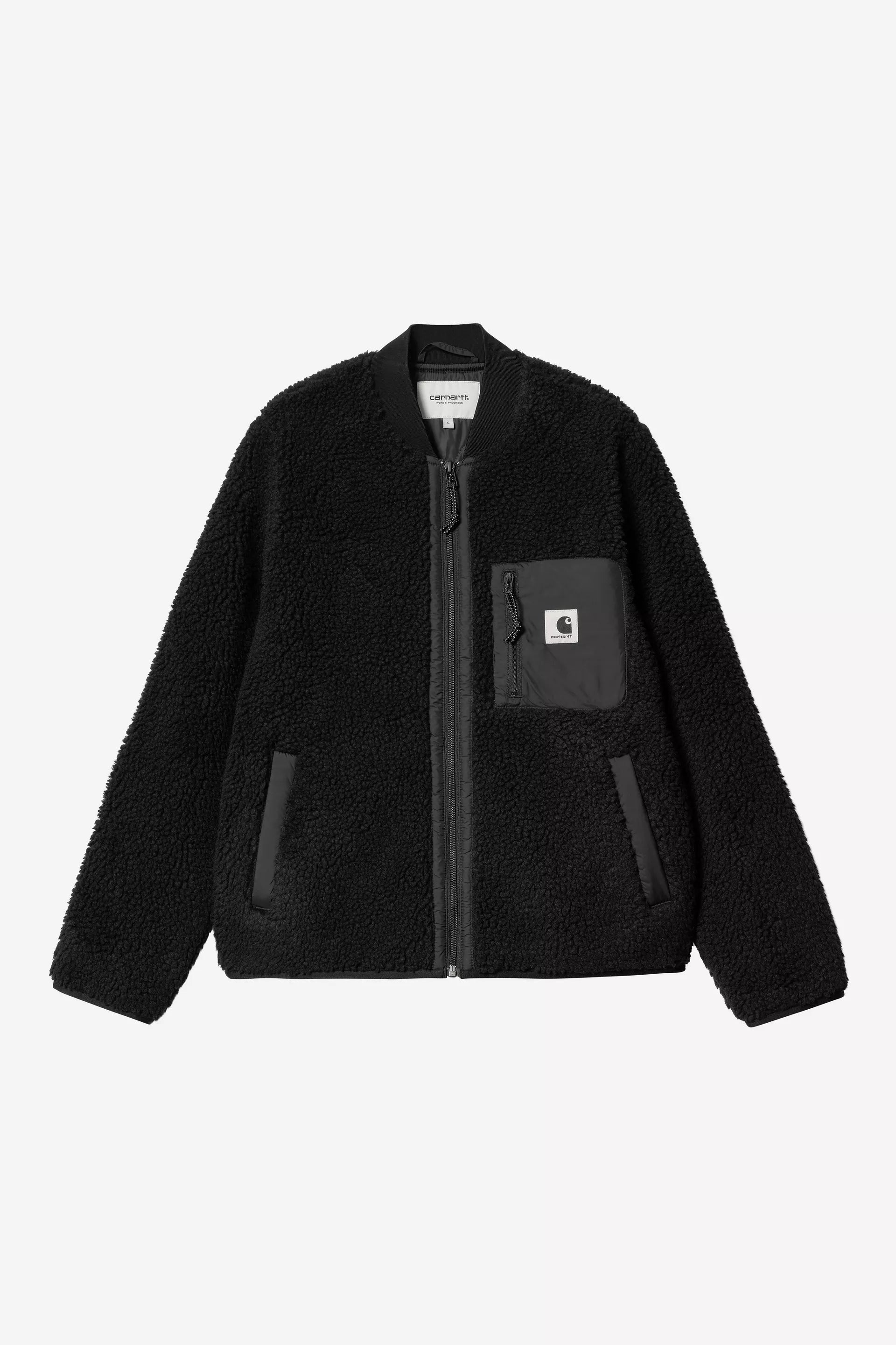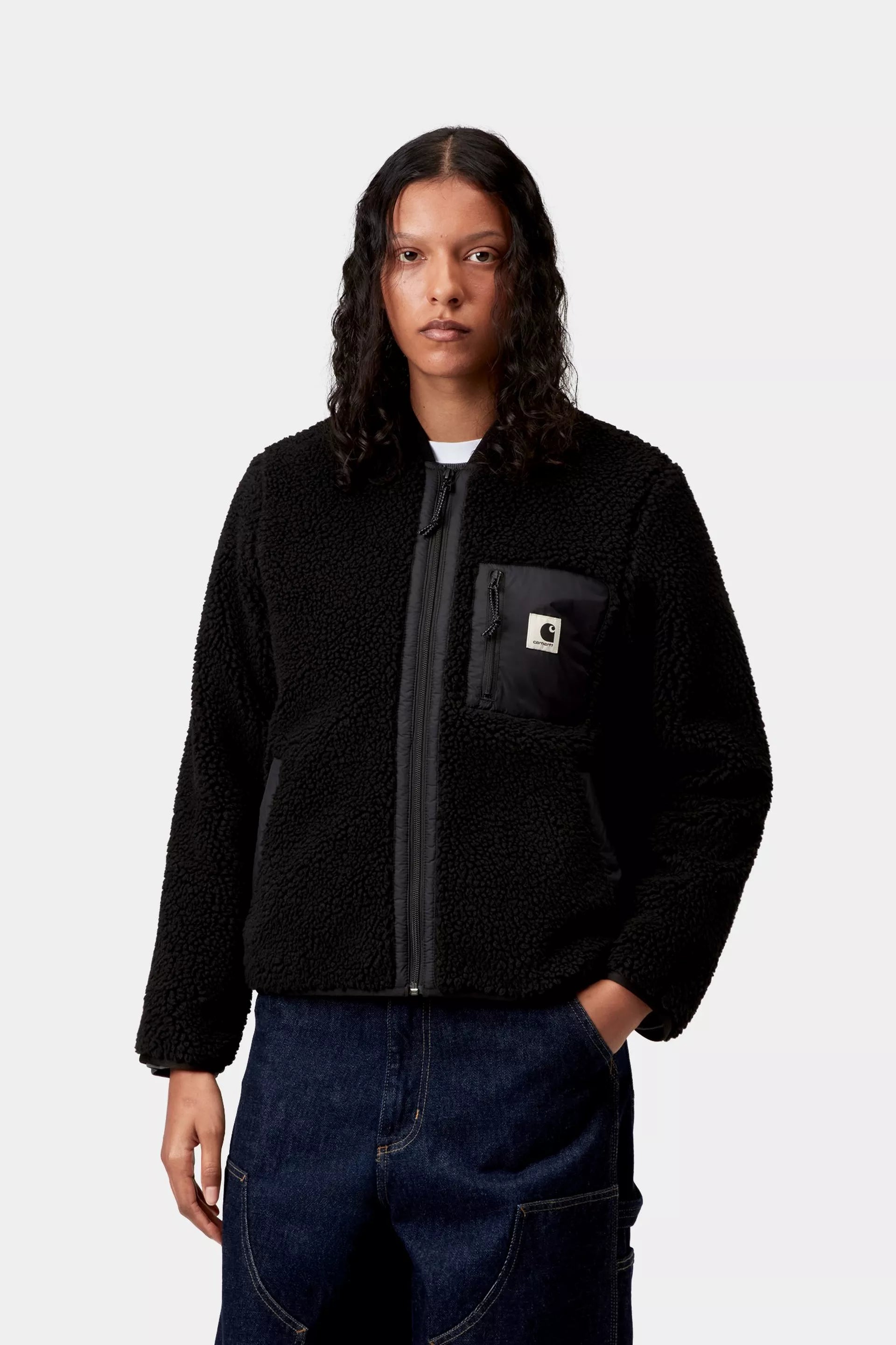 La W’ Janet Liner è realizzata in pile pesante 10,03 once e presenta dettagli in taffetà di nylon a contrasto e un solo taschino sul petto con etichetta Carhartt WIP. È caratterizzata da fodera in taffetà di nylon e da collo in maglia a coste.